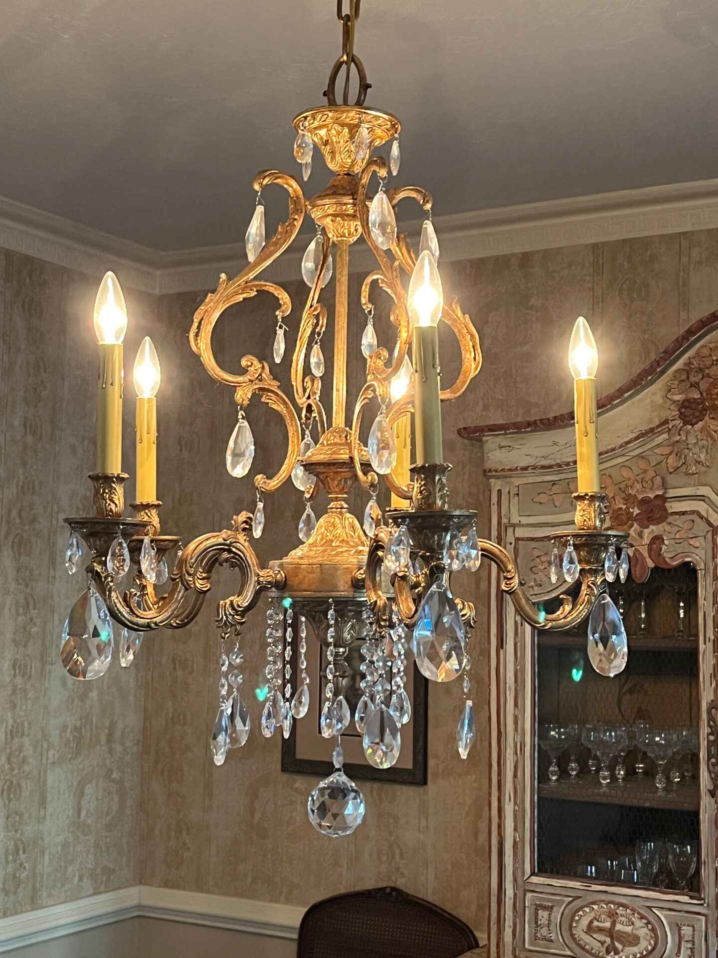 This piece features an intricately designed gold-plated frame, that enhances its overall aesthetic. Clear crystals gracefully drape throughout the chandelier, adding a touch of opulence and brilliance to its presence.